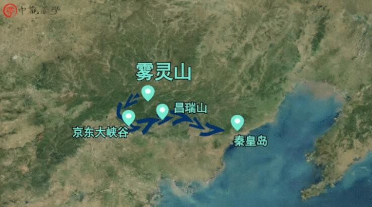 雾灵山往南又生发平谷的京东大峡脉,大峡脉向东生发出东陵所在的昌瑞山,昌瑞山东行生青龙山,直到秦皇岛。