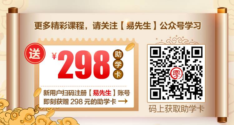 扫描下方二维码,注册易先生平台,即可获赠298元代金券!王进武老师的《从零开始学风水》、付刚老师的《从零开始学紫微斗数》、崔国文教授的《从零开始学奇门》、赵泽老师的《从零开始学八字》这四门课程,任选其一进行免费学习哦~