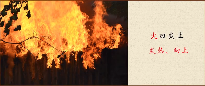 我们再看五行火,一说到火,我们可以联想到燃烧的火,所以古人说火曰炎上,是说火具有炎热和向上的特性。