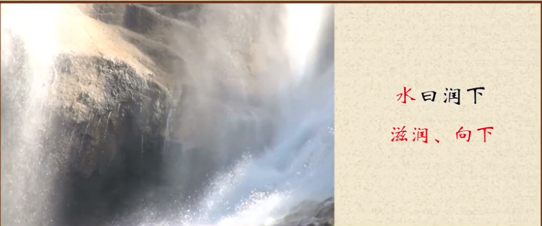 我们再看五行水,一说到水,我们可以联想到大河水,地下水,所以古人说水曰润下,是说水具有滋润和向下流动的特性。