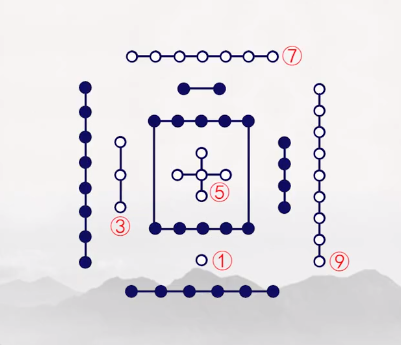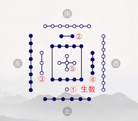 并且,每个方位的白点和黑点数相减,正好为5。这就是易经文化的生数和成数概念。