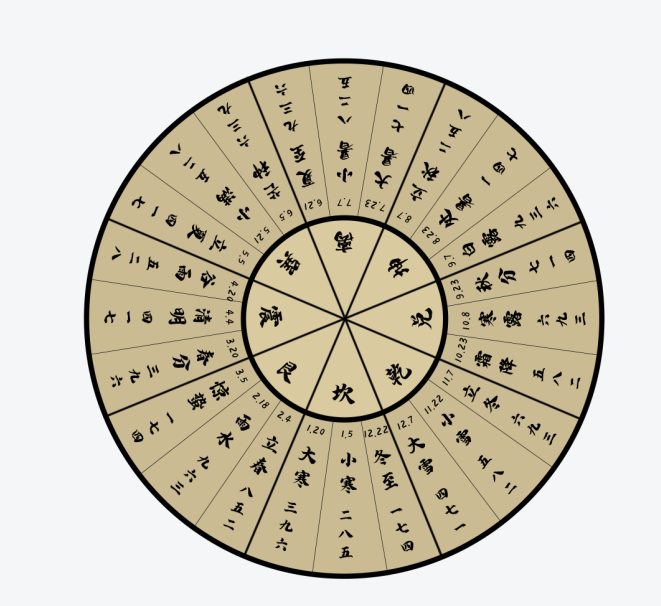 坎卦统领冬至、小寒、大寒三个节气,艮卦统领立春、雨水、惊蛰,震卦统领春分、清明、谷雨,巽卦统领立夏、小满、芒种,离卦统领夏至、小暑、大暑,坤卦统领立秋、处暑、白露,兑卦统领秋分、寒露、霜降,乾卦统领立冬、小雪、大雪,八个卦对应的就是24个节气。