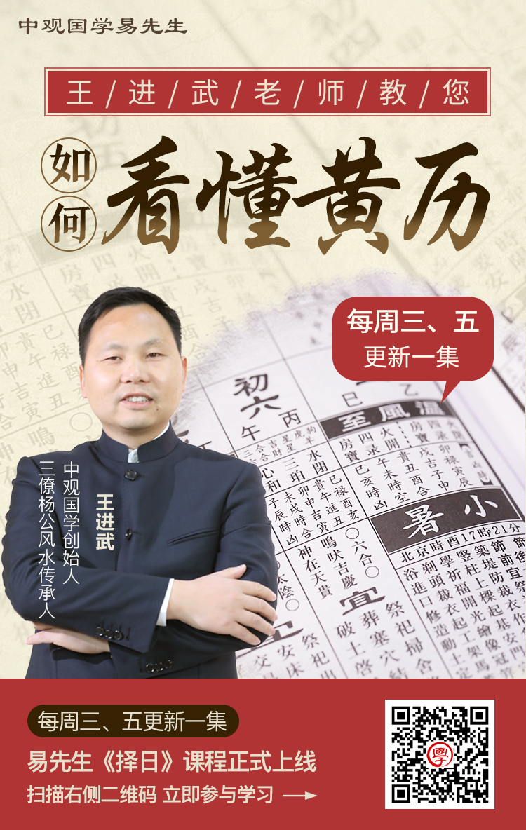 为了响应广大学员的呼声、满足广大易学爱好者的择日学习需求,三僚杨公风水传承人、风水术数明师、择日术数明师、中观国学创始人王进武老师将带领大家一起来学习择日知识,为此特地研发录制了择日课程——《王老师教您如何看懂黄历》 !