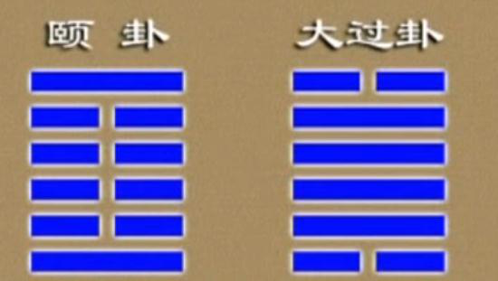 第三组为:颐卦和大过卦,第27卦为颐卦,山雷颐,颐卦的形状像张开的口准备吃东西,一般认为占到颐卦不用担心没得吃。颐:贞吉。观颐,自求口实,能够自食其力。大过卦为第28卦,泽风大过,兑上巽下,大过卦象征大的过度,大水淹没了树木,则过甚。过者,越也。大过象征大为过甚,含有过失的意思,但结局使人喜悦,有可行之道,故前进亨通。