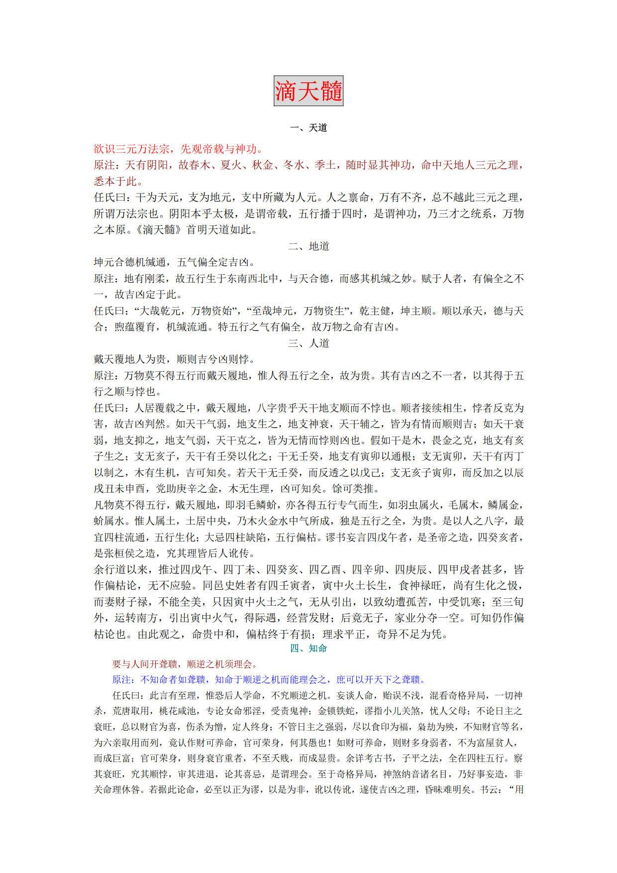 《滴天髓》是古代中国命理学著作。该书文中大多用骈文,言简意赅。民国命理学家徐乐吾《子平真诠评注》序中所说:“此中旧籍,首推《滴天髓》与《子平真诠》二书,最为完备精审,后世言命学者,千言万语,不能越其范围,如江河日月,不可废者。”又说: “后学者研究命学原理,得此二书,不致于误入歧途。”