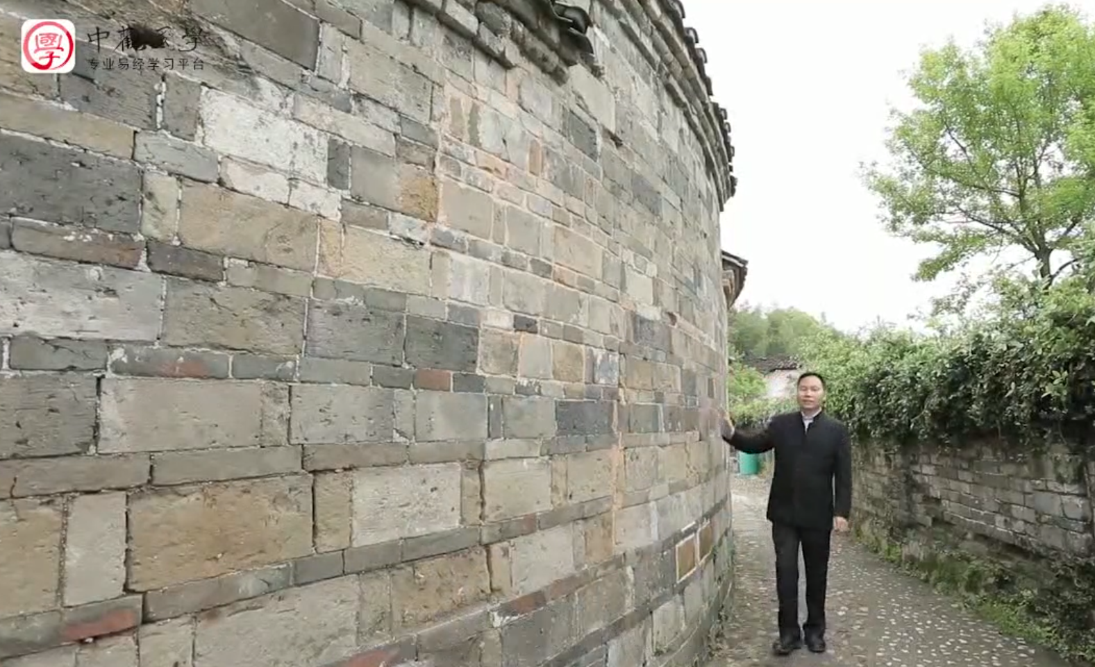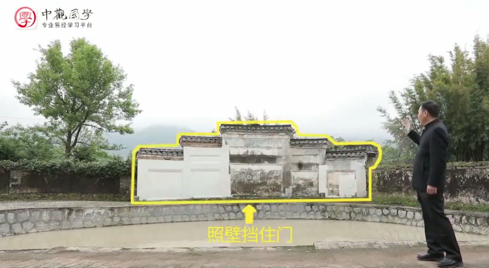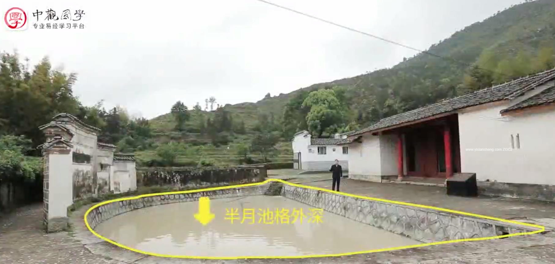 再来看房屋前面的这片半月形水塘,在整个明堂中间也代表二房。这个池塘池深不见底,代表二房如果跌进去是爬不出来,池塘里的这个石头在中间代表二房,这个石头它有个角度,是向内倾斜的,使得下雨水是不能够直接流向塘内,也暗指二房生财无望。为什么这个祠堂的风水是对老二处处设置障碍使其败绝呢?