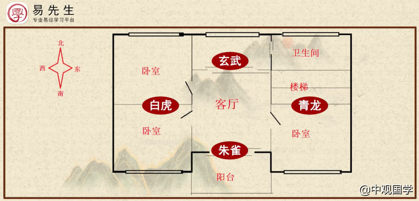 假如,你的房屋正好是坐北朝南,不管是讲东西,还是左右,都能对应的上,但我们的风水是讲依山傍水,并不是所有的房屋都是坐北朝南的,假如你的房屋是坐南朝北,那左边就正好是在西边了,那就成了左白虎了,那这到底应该是采用哪一种说法呢,其实在风水上用青龙、白虎、朱雀、玄武这四个名字,是用这四象代表我们房屋前后左右的环境,取其护卫之意,是只论房屋四周的四象,不用再论整个宇宙的四象了,所以,不管我们房屋的坐山朝向怎么来变,我们始终是以房屋自身的中心点来论四象,那就是左青龙右白虎前朱雀后玄武。
