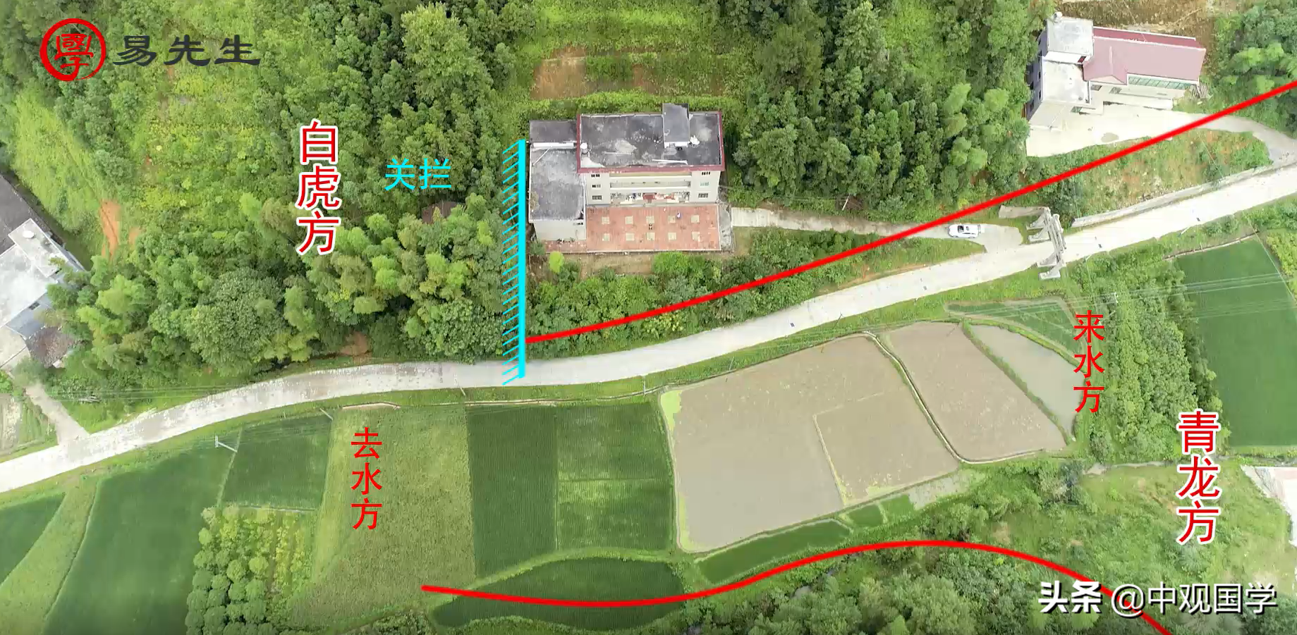这个房屋的地势是青龙方高,水是往白虎方走的,那么这种地方在风水上还有另外一句话叫“来水方要宽大,去水方要有关拦”,我们站在大门口肉眼看到的整个来水方都是宽大无比,而且我们站到大门口修建了一个白虎方的房子,加上白虎方的砂手,看到整个白虎方的水就关在眼前,这就显示了水聚明堂。