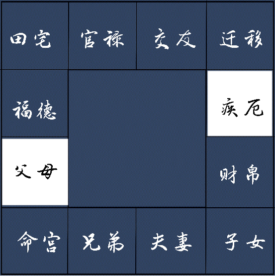 在这个体系中,疾厄宫和父母宫处于太极关系中。疾厄代表身体与情绪,父母代表父母长辈。我们的身体是父母所赋予的,精神情绪也常常受父母影响。因此疾厄宫与父母宫互为表里,一阴一阳,反应我们身体到精神上表现出的种种不同来。