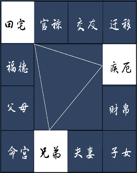 而与疾厄宫会合的“三方四正”,则是兄弟宫与田宅宫。这古代封建社会,家庭成员犯罪,常常可以牵连亲友,因之这个三方四正的组成,便有了合理性。