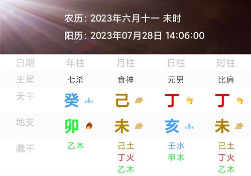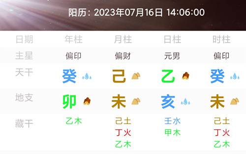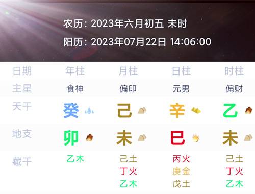 7月22日的日柱为“辛巳”,这个日子也是可选的,没有刑冲,除了“卯未合”,日支与月支形成“巳未拱会”,地支有巳未,巳未拱会丙禄,也可称为拱会火局,对五行喜火的人尤其友好。