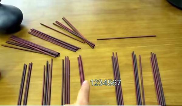 第八步:三次完成后的蓍草按照四根一组分配,分配有几组就为数字几,比如余下7组,对应数字就为7,按照偶数阴,奇数阳的规律,7为阳,即为阳爻。