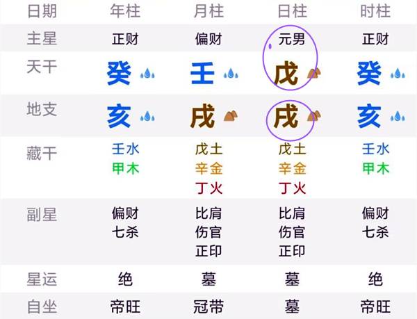 日柱“戊戌”,戊土坐下“戌土”,同为土,且“戊戌”还为“魁罡”,刚毅要强,这就是比肩占据了“婚姻宫”的位置,配偶和比肩住在一起了,配偶比较容易出轨。