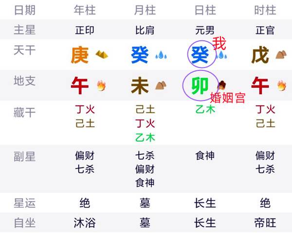 以上八字中,癸水坐下卯木,卯木乃四桃花之一,就为“自坐桃花宫”,桃花星乃子午卯酉,日支带桃花,多相貌好看有魅力,性情风流,异性缘好,比如命中可以靠异性来获得名利。这样的“日支”可以理解为是“友军”的关系,桃花虽然名声欠佳,但也要分是“正桃花”还是“桃花劫”,男命临财或食伤,如图中癸水生卯木,为食神桃花,女命临财或官杀,桃花一般可以为命主带来有利的一面,是为“友军”。