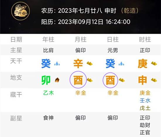 今天的酉酉自刑也叫伏吟局,月柱与日柱伏吟,不利于婚姻之相,日柱是一个家,但月柱又有一个家,两个家了,代表婚烟不顺。