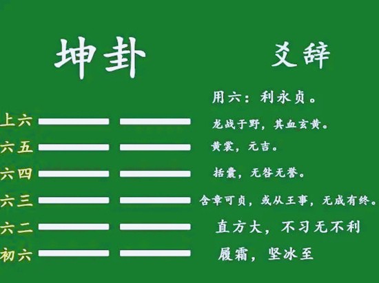 坤卦六爻皆阴,似乎所有因素都不利,坤为地,代表谦卑,卑下,只能屈不能伸,坤卦也表示发展不利,难以发展,只能安分守己,柔顺忍耐,在忍耐中等待时机。