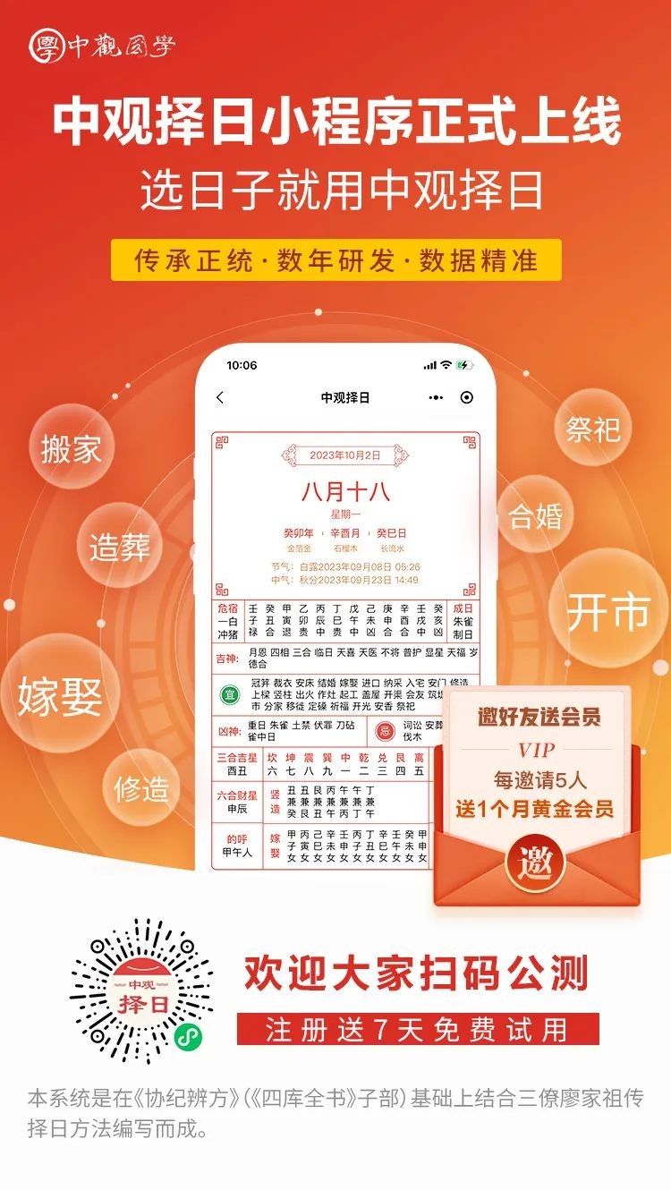 在这种背景下,中观国学研发团队研发编写出[中观择日软件]和《中观国学大通书》,其底层算法由中观国学创始人王进武老师亲自编写,王进武老师的师父三僚廖家风水传人廖书生先生亲自指导。该软件的研发及通书的编纂,王进武老师参考了《协纪辨方书》和三僚(择日学发源地)风水世家廖氏家传的《克择大要旨诀》等源头书籍,历时五年完成。旨在为易学爱好者提供最为专业、全面、便捷的择日工具。