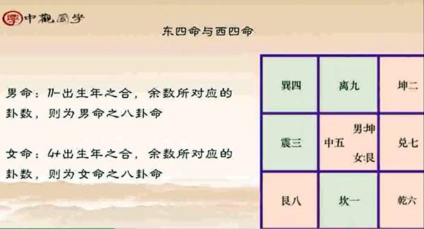 王进武老师讲要看每个人的“卦命”,推算出“八宅”,如算出你是“东四命”的“巽卦命”或“离卦命”;根据“卦命”推算出“九星”,有了“九星”就可以推算出你是在“吉星”还是“凶星”。