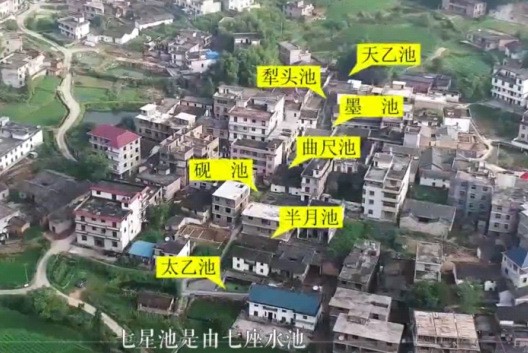 七星池是从村中中央由北向南排去,池池互通,气脉贯连,最前的是太乙池,后面是半月池半圆属金,接着是墨砚池属水。然后是曲尺池属木,再是墨池又名玉尺池,属木长方形,然后是犁头池属火,,最后是天乙池。同时在天乙池后堆造章罡土,堵泻了煞气的迫逼。