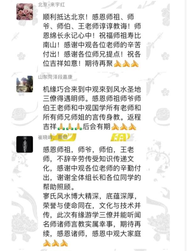 在告别时,大家纷纷感谢中观国学组织的此次活动,让大家收获满满,受益颇多。王进武老师在临别时,给大家赠言讲到:风水文化相传千年,需要去伪存真,去其糟粕,保留精华,这样才能真正学习好风水文化,君子才能真正藏器于身,知周乎万物,而道济天下!
