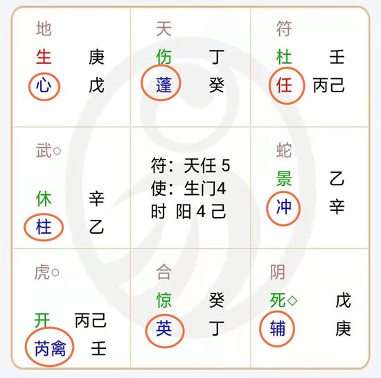 天蓬和天英互换了宫位,天任和天芮也是如此,天心和天辅形成了金木冲,天柱和天冲也一样,全部跑到相反的宫位里去了。