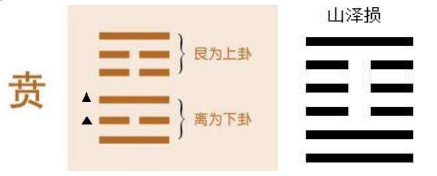 如果我们照此方法重复三六十八次,得出的六个数字是:7 6 9 8 8 7,单数阳,双数阴,我们画出阴阳爻,就得到了一个山火贲bì卦,得出的贲卦叫本卦,还要有变卦,此卦中第二爻老阴和第三爻老阳,就是动爻,阴阳互变就成了山泽损卦。