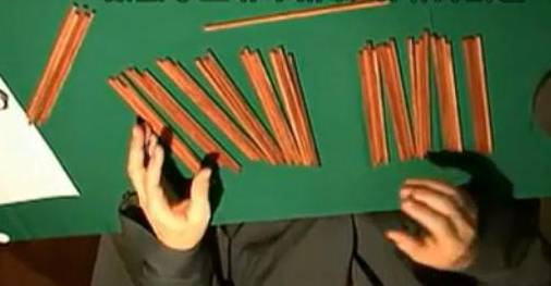 第四步:右边的竹签不需要单独拿一根在手上,也是同样的方法,四个一组分配,最后拿出余数,或者没有余数,就拿掉4个竹签,和左手的竹签合在一起,置于左前方不用。