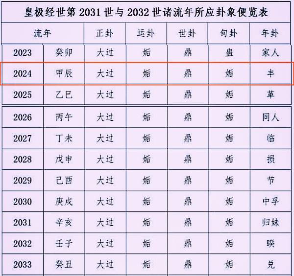我们每个人的运势都离不开大环境和宏观运势,我们现在所处的十年正是《皇极经世》旬卦的“姤卦”,天风姤,时间为(2024年到2033年),2024的年卦是“丰卦”。