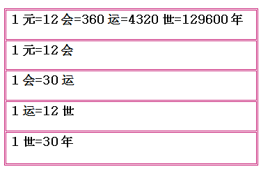 “元、会、运、世”这四个时间单位是是什么关系呢,我们这里做一下数学题,“元、会、运、世”用算法来计算公式如下: