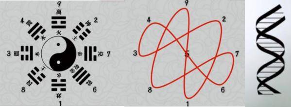 而近年来有科学家还发现,文王八卦图背后隐藏的超级科学,把文王八卦图的九个数字按照1、2、3、4、5、6、7、8、9的顺序依次连接起来,结果竟然是双螺旋的结构,这个双螺旋的连线就是我们人体DNA的基本结构——核糖核酸的外形。