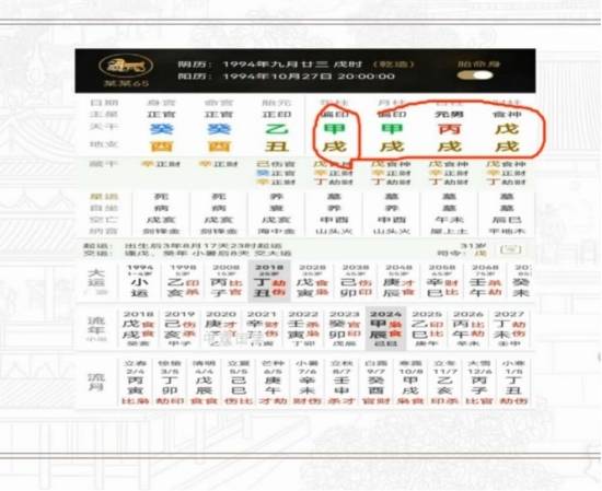 *时柱有戌冲子女宫:代表和子女的感情和关系不大和谐,古人的“冲”和我们今天的观念不一样,古代都是大家庭几辈人住在一起,冲就不好了,但现在都是小家庭,所以这个冲的问题不大。