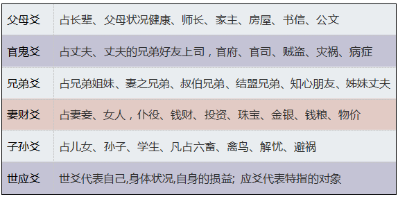 六亲:父母,官鬼,兄弟,妻财,子孙,世应,代表我们生活中的一切人和事,六爻占卜中六亲是非常重要的内容,代表了不同的类像: