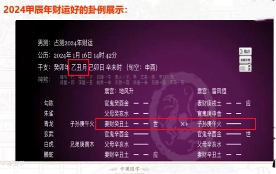 预测财运是以妻财为用神,世爻代表求测人,“妻财”为癸丑土,而这个月正好是乙丑月,世爻临财,财爻值事,代表求财人与财有缘,用神值事,是利财的吉兆的卦,再看变卦,变成“子孙爻”午火,子孙和妻财的关系是子孙生妻财,子孙是财之源,正好是“火生土”,动卦回头生,是财源滚滚之象,变成午火爻,也代表财运最好的时机是在2024年立夏之后,这就是六爻占卜2024甲辰年财运好的卦象。