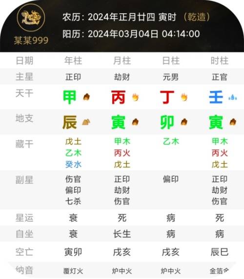 干支为:甲辰年 丙寅月 丁卯日 壬寅时