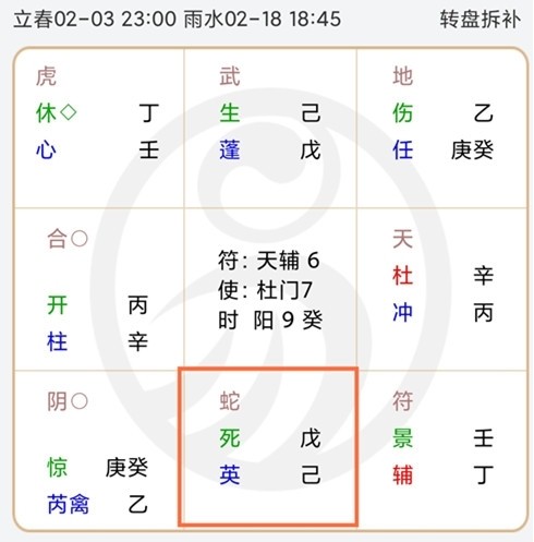 此盘中,戊土落在坎水一宫,水旺,水土相克,临死门,逢螣蛇,在奇门遁甲的综合信息中,戊土落宫的状况对财运不利。