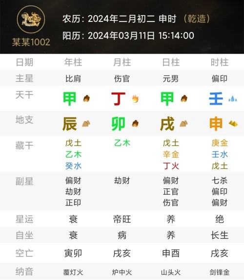 今天的干支四柱为:甲辰 丁卯 甲戌 壬申,甲辰年甲戌日,可谓是双贵加倍助力,月日卯戌相合,但年日辰戌相冲,也叫做“冲动太岁日”,八字命理日支戌冲太岁辰,但逢“龙抬头”,好比大水冲了龙王庙,都是一家人嘛!