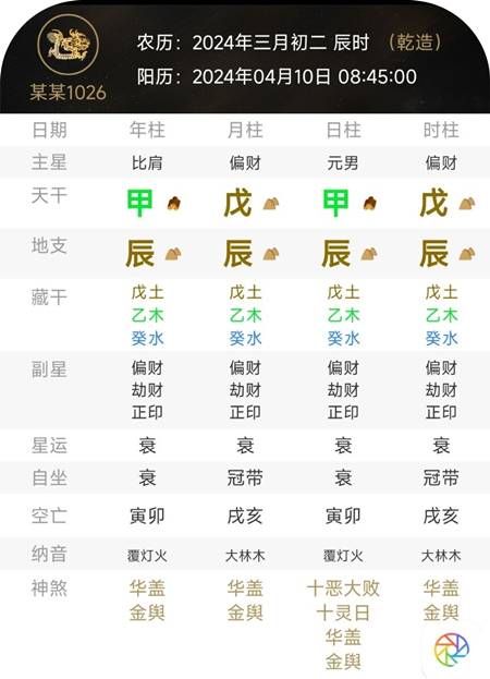 八字为:甲辰年,戊辰月,甲辰日,戊辰时,四龙聚首,四辰一气。