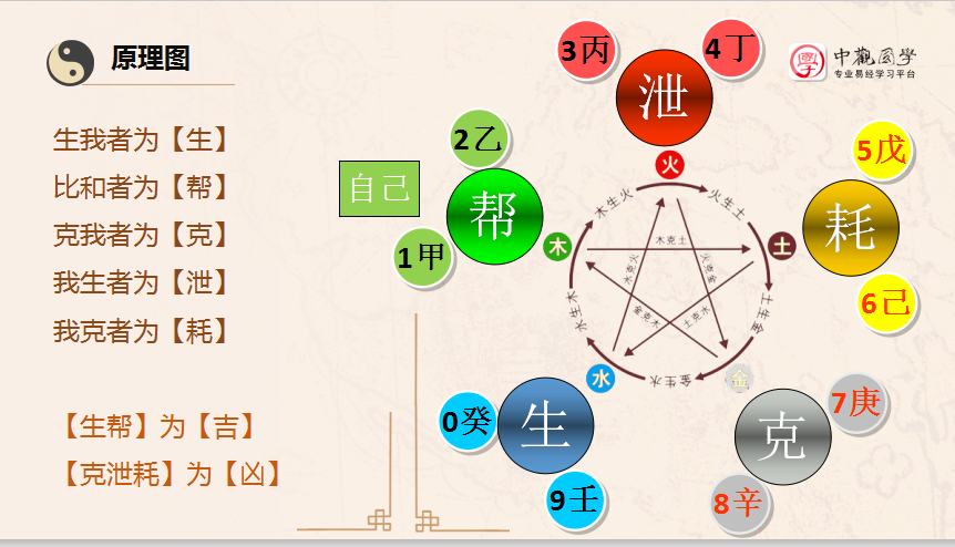 以甲木(1)乙木(2)为例,甲和乙生甲乙木的是壬癸水,也就是数字9和0生数字1和2;克甲乙木的是庚辛金,也就是数字7和8克数字1和2;耗甲乙木的是戊己土,也就是数字5和6耗数字1和2;泄甲乙木的是丙丁火,也就是数字3和4泄数字1和2。